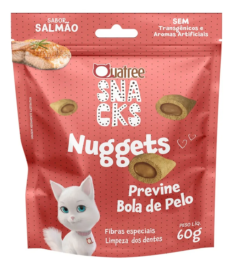 O Quatree Snacks Nuggets sabor salmão é um petisco funcional desenvolvido especialmente para gatos, combinando sabor irresistível com benefícios para a saúde. Com textura crocante por fora e recheio macio por dentro, ele é perfeito para agradar seu felino no dia a dia.